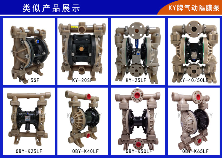 氟塑料隔膜泵是耐腐蝕性能非常強的水泵,外殼采用耐腐性較強的PVDF材質??蛇m用于除熔融態堿鹽以外的任何強酸、強堿及各類有機溶劑,應用范圍極其廣泛。KY40LF硫酸隔膜泵對于各種腐蝕性液體、帶顆粒、高粘度、易揮發、易燃、易爆、劇毒的液體、陶瓷釉漿、果漿、膠水、油輪倉底油回收、臨時倒罐等液體均能予以抽光吸盡;尤其可以解決葉片式泵的跑、冒、滴、漏及不允許空轉等問題,是目前國內新穎的一種采用壓縮空氣為動力源,通過氣閥往復運動分配空氣,帶動隔膜擠壓輸送介質的容積式水泵,KY-40LF氣動隔膜泵集雜質泵、自吸泵、泥漿泵、屏蔽泵、潛水泵等輸送機械的優點于一體。