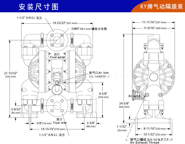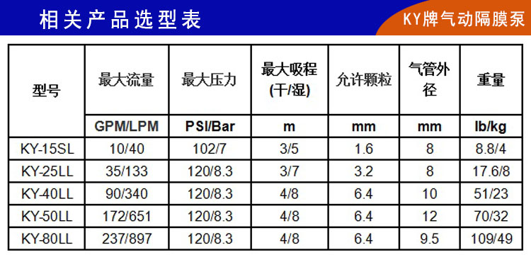 6)、KY40LF氣動隔膜泵整體構造上更加優化,泵腔和主管路都有明顯加強,自吸功能和流量揚程都有很大改善,并且可通過氣閥開度實現無級調節
