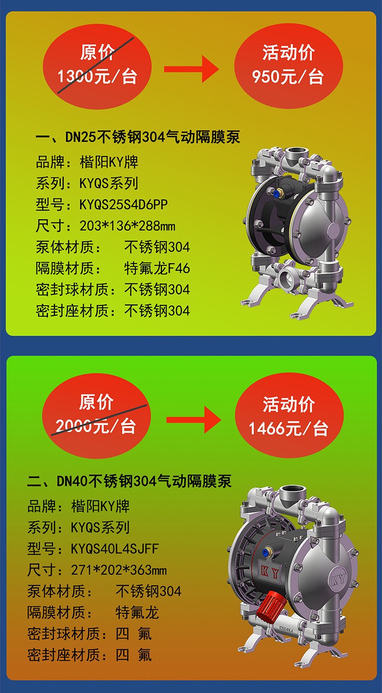 本期活動為楷陽氣動隔膜泵四大系列中的KYQS輕巧靈便系列產品,九大材質中的不銹鋼304和鋁合金材質產品,詳情請仔細閱讀以下細則: